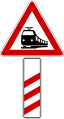 Bahnübergang mit dreistreifiger Bake etwa 240 m vor dem Bahnübergang. Die Angabe erheblich abweichender Abstände kann an der dreistreifigen, zweistreifigen und einstreifigen Bake oberhalb der Schrägstreifen in schwarzen Ziffern erfolgen.