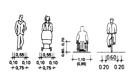 | Für jeden Verkehrsteilnehmer stehen bei der Bewegung im öffentlichen Verkehrsraum unterschiedlichen Querschnitte zu. Die Reglemaße sind der RAS-Q zu entnehmen. Eine Darstellung der einzelnen Verkehrsarten mit den Grundmaßen sind in der EAHV bzw. der EAE graphisch dargestellt. | |||||||||||||||||||||||||||||||||||||